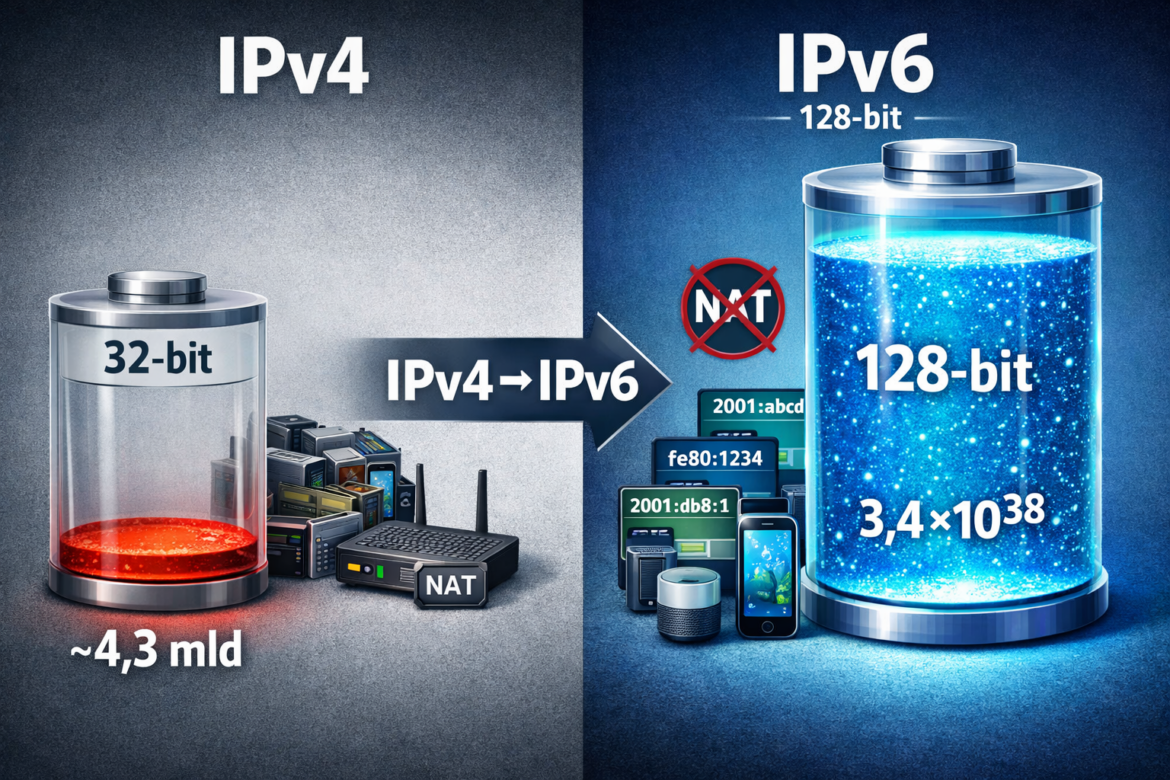W poprzednim artykule omówiliśmy, czym jest protokół IP oraz jak działa adres IPv4. Problem w tym, że wraz z ogromnym rozwojem Internetu pula adresów IPv4 zaczęła się kurczyć – i to szybciej, niż początkowo zakładano.
