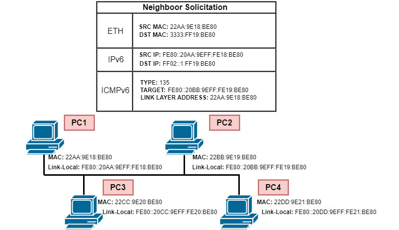 Spójrzmy na przykład pokazany na rysunku. Gdy PC1 chce rozwiązać fizyczny adres (MAC) PC2 o adresie IPv6: FE80::20BB:9EFF:FE19:BE80, musi wysłać komunikat Neighbor Solicitation (NS), czyli pakiet ICMPv6 typu 135.