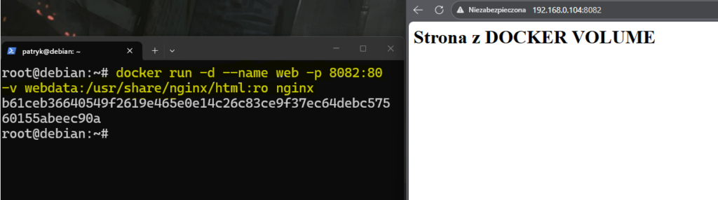docker run --rm -v webdata:/data busybox sh -c 'echo "<h1>Strona z DOCKER VOLUME</h1>" > /data/index.html