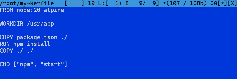 • CMD określa polecenie do uruchomienia. Odpala skrypt start z package.json, czyli w tym przypadku node app.js