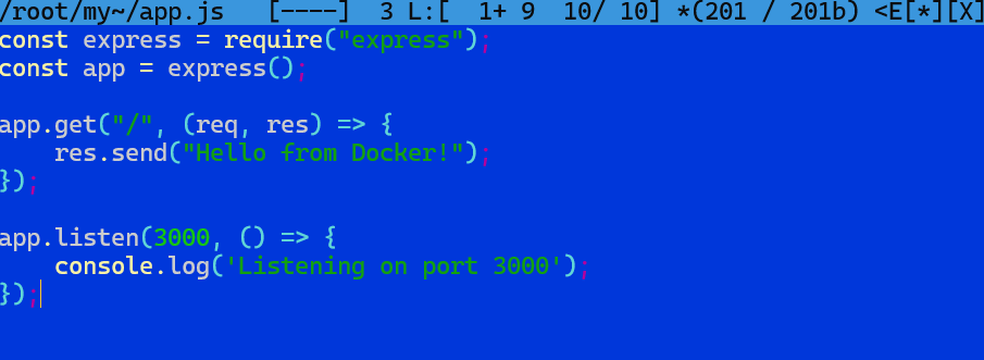 Kolejnym plikiem, który warto utworzyć jest app.js. W pliku tym będzie znajdował się kod aplikacji uruchamianej w kontenerze. Nie wchodząc w szczegóły programowania jest to prosty serwer HTTP z Node.js z użyciem Expressa. Kod ten sprawi, że gdy ktoś wejdzie na hoście na adres serwera z portem 3000, wówczas dostanie odpowiedź “Hello from Docker!”.