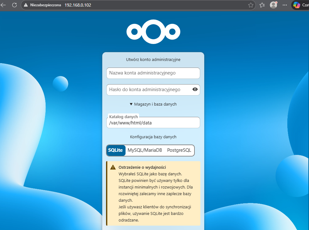 Finalnie wchodząc w przeglądarce na adres serwera na porcie 80 ujrzysz stronę początkową Nextclouda. Przy pierwszym uruchomieniu Nextcloud pokaże kreator instalacji. Wybierz bazę PostgreSQL i podaj dane zgodne z compose.yaml: