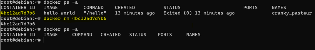 Nieużywane kontenery można w łatwy sposób usunąć za pomocą polecenia docker rm, po którym należy wskazać jego nazwę lub ID. Aby sprawdzić identyfikator możesz skorzystać z polecenia, o którym wspomniałem wyżej. Można również usunąć wszystkie wstrzymane kontenery za jednym zamachem za pomocą polecenia docker system prune.