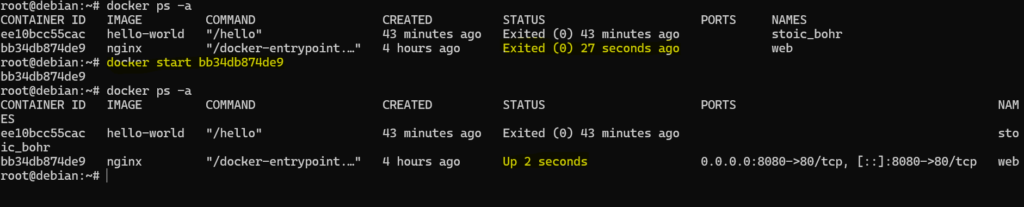 Wspominałem o możliwości zatrzymywania kontenerów za pomocą polecenia docker stop. Możemy również przywracać zatrzymany w ten sposób kontenery za pomocą polecenia docker start.