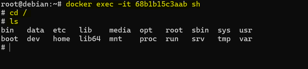 Może zajść potrzeba, że chcemy zajrzeć do systemu kontenera i podejrzeć co się w nim znajduje, np. poleceniem ls. Do shella można się dostać w poniższy sposób. Aby wyjść z shella, należy skorzystać z kombinacji klawiszy ctrl+D.