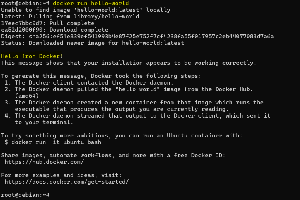 • Jeśli nie masz obrazu hello-world lokalnie, Docker go pobierze z repozytoriów (pull),