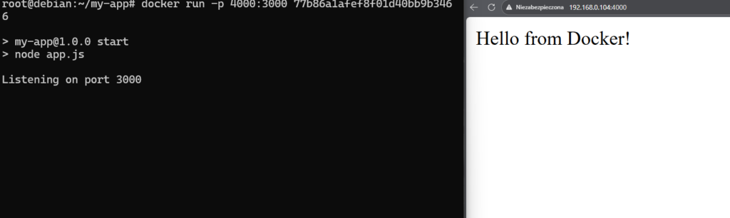 Po uruchomieniu kontenera aplikacja będzie dostępna na hoście pod adresem maszyny wirtualnej na porcie 4000.