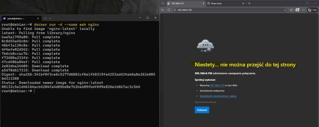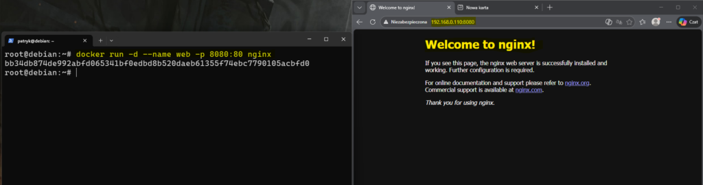 Aby naprawić ten problem, wystarczy zmapować port, na którym działa nginx w kontenerze, na przykładowo port 8080 w systemie hosta