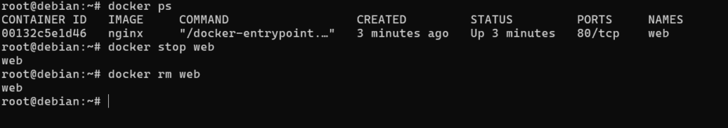 Po testach zatrzymaj i usuń kontener poniższymi poleceniami. Do zatrzymywania kontenera służy polecenie docker stop. Polecenie to w bezpieczny sposób zatrzymuje kontener. Istnieje również polecenie docker kill, które robi to natychmiast.