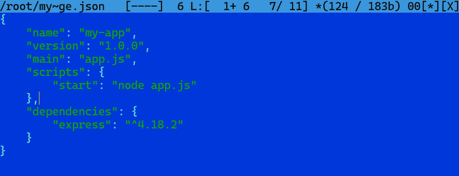 Plik ten opisuje konfiguracje projektu Node.js. Zawiera nazwę i wersje projektu, a także wskazuję główny plik ze skryptem. W skrócie plik ten mówi między innymi npm-owi jak uruchomić aplikację i jakie biblioteki ma zainstalować. Dzięki temu później w pliku Dockerfile wystarczy, że wpiszemy komendę npm install i npm będział, że ma zainstalować expressa.