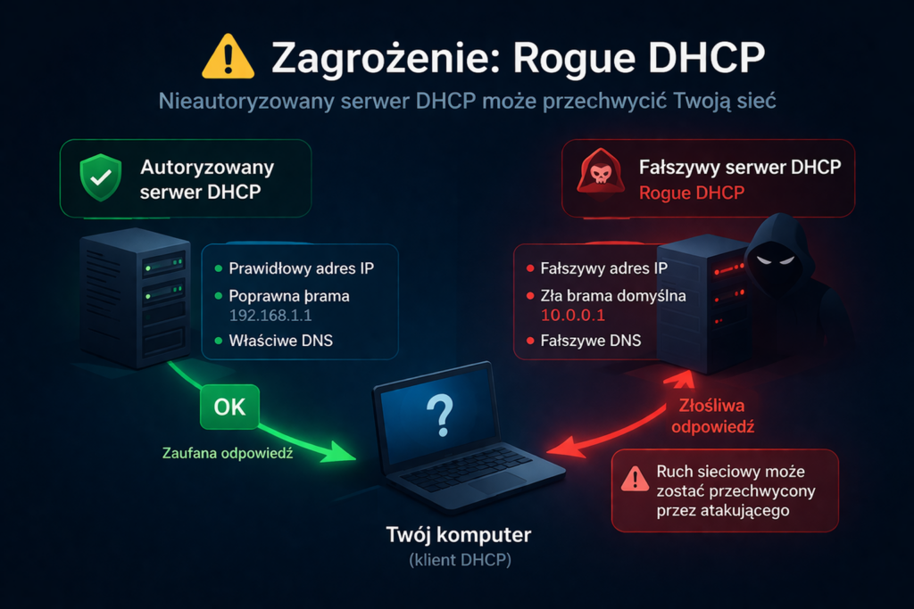 To szczególnie niebezpieczne dlatego, że klient DHCP zwykle po prostu przyjmuje pierwszą poprawnie wyglądającą odpowiedź. Jeśli więc atakujący uruchomi własny serwer DHCP w tej samej sieci, może sprawić, że ruch użytkowników zacznie przechodzić przez jego urządzenie. W ten sposób da się przygotować grunt pod podsłuchiwanie ruchu, przekierowywanie połączeń albo ataki typu man-in-the-middle. Z punktu widzenia użytkownika wszystko może wyglądać normalnie – komputer “dostał adres i działa”, ale cała konfiguracja została podana przez nieautoryzowane źródło.