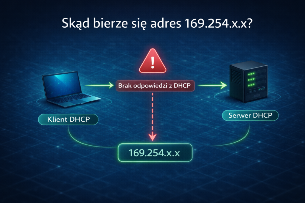 To bardzo ważny sygnał diagnostyczny. Jeśli widzisz 169.254.x.x, nie oznacza to “dziwny adres”, tylko bardzo konkretny problem: klient nie dostał prawidłowej konfiguracji z DHCP.