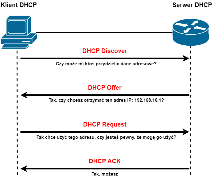 DHCP działa w modelu klient–serwer. Oznacza to, że host, który potrzebuje konfiguracji, pełni rolę klienta DHCP, a urządzenie rozdające ustawienia działa jako serwer DHCP. Cały proces przydzielenia adresu opiera się na wymianie kilku komunikatów. To właśnie z nich bierze się znany skrót DORA.