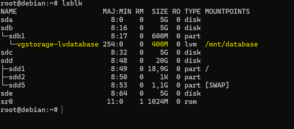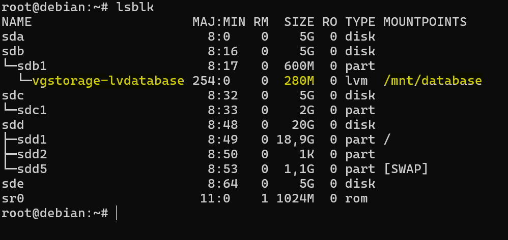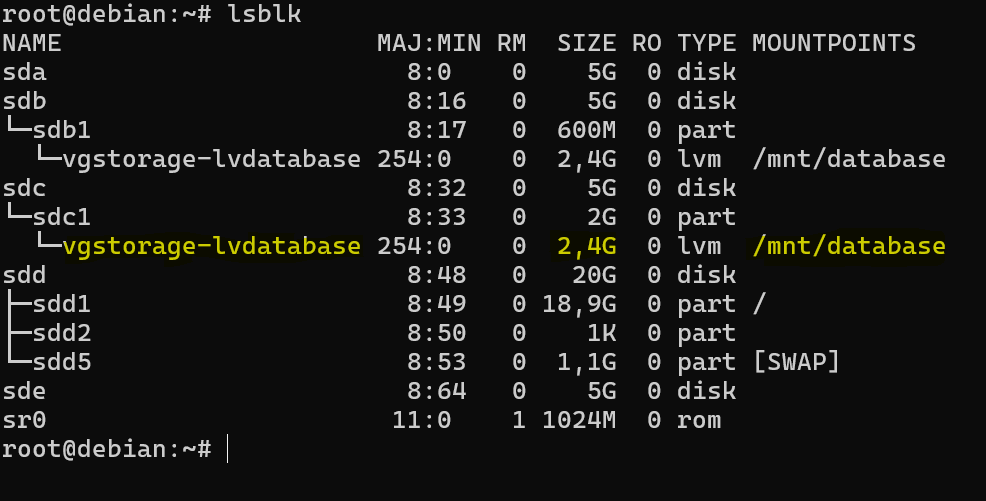 Po wydaniu polecenia lsblk można zauważyć, że partycja /dev/sdc1 została wciągnięta do wolumenu logicznego, teraz ma prawie 2,5GB i jest również zamontowana do katalogu /mnt/database.