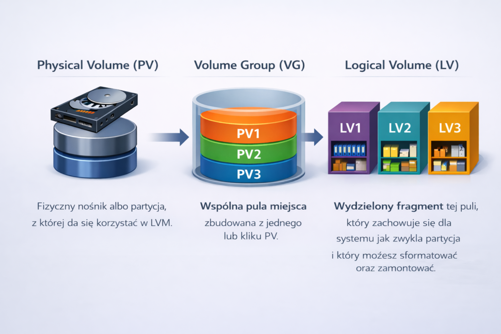 Najprościej można to porównać do magazynu. Physical Volume (PV) to fizyczny nośnik albo partycja, z której da się korzystać w LVM. Volume Group (VG) to wspólna pula miejsca zbudowana z jednego lub kilku PV. Logical Volume (LV) to wydzielony fragment tej puli, który zachowuje się dla systemu jak zwykła partycja i który możesz sformatować oraz zamontować.