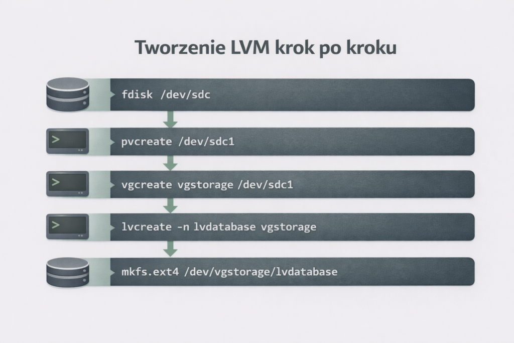 Schemat działania LVM jest zwykle bardzo podobny, niezależnie od konkretnego przypadku. Najpierw przygotowujesz dysk lub partycję, potem tworzysz z niej PV, następnie budujesz VG, a na końcu wydzielasz z niej LV. Dopiero taki wolumen logiczny formatujesz i montujesz w systemie. Całość ma więc swoją kolejność i dobrze jest się jej trzymać.