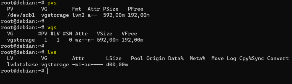 Po skonfigurowaniu LVM warto umieć szybko sprawdzać, co dokładnie zostało utworzone. Do tego służą między innymi polecenia pvs, vgs i lvs. Każde z nich pokazuje inny poziom struktury LVM: fizyczne wolumeny, grupy wolumenów i wolumeny logiczne. To taki podstawowy zestaw diagnostyczny, który naprawdę warto znać na pamięć.