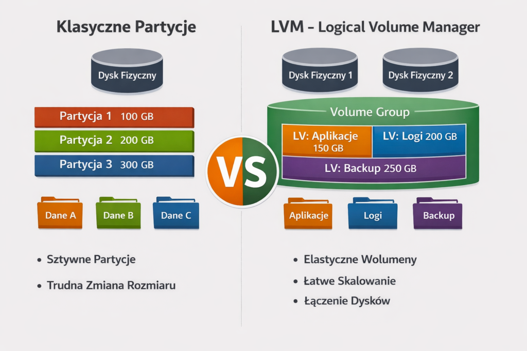 W klasycznym podejściu tworzysz partycję, formatujesz ją i używasz. Problem pojawia się wtedy, gdy jedna partycja zaczyna pękać w szwach, a druga obok jest prawie pusta. Przy tradycyjnym podziale dysku przenoszenie miejsca między partycjami nie jest ani szybkie, ani wygodne. LVM rozwiązuje ten problem, bo pozwala dużo łatwiej zarządzać przestrzenią dyskową i dopasowywać ją do realnych potrzeb systemu.