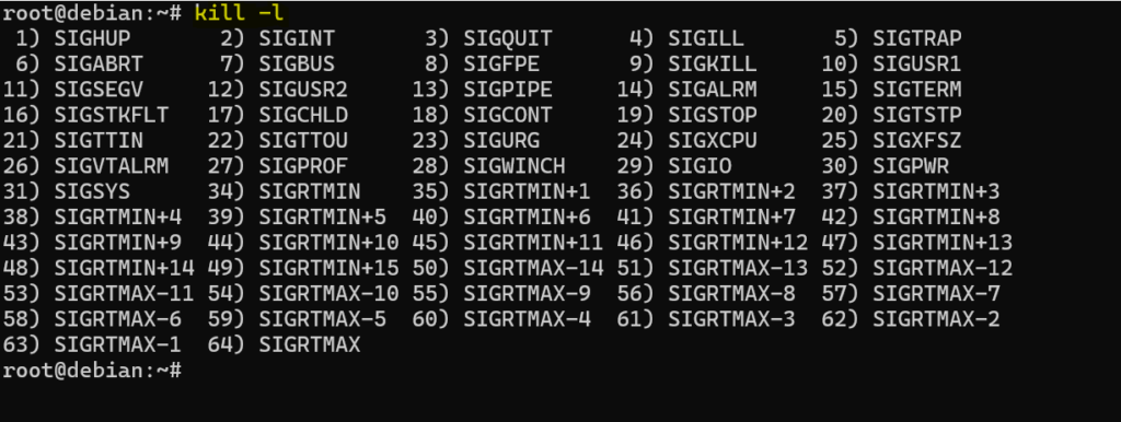 Polecenie kill nie służy wyłącznie do kończenia procesów, mimo że nazwa sugeruje dość jednoznaczne intencje. Tak naprawdę wysyła ono sygnał do procesu, a sygnał może oznaczać różne rzeczy: zakończenie, przerwanie, przeładowanie konfiguracji albo inne zachowanie zależne od programu. Każdy sygnał ma unikalny numer i nazwę, co umożliwia precyzyjną kontrolę nad zarządzaniem procesami. Wszystkie sygnały jakie posiada polecenie kill można wylistować poniższym poleceniem.