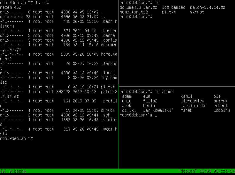 Jedną z największych zalet tmux jest możliwość podziału okna na wiele paneli. Dzięki temu możesz mieć na jednym ekranie kilka terminali jednocześnie: w jednym obserwować logi, w drugim mieć htop, w trzecim edytować plik, a w czwartym testować połączenia.