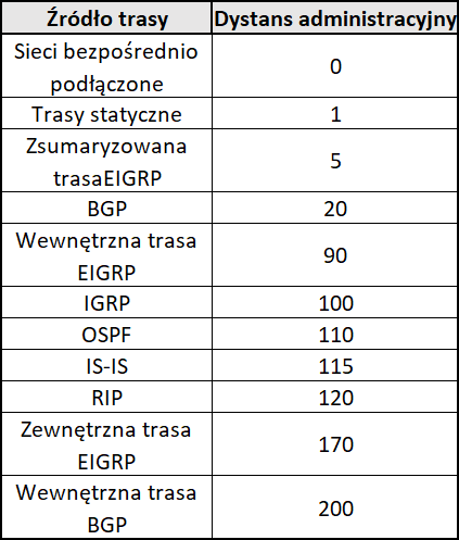Jeśli więc router zna dwie trasy do tej samej sieci – jedną statyczną i jedną z RIP -najczęściej wybierze trasę statyczną, bo jej dystans administracyjny jest niższy. Poniższa tabela przedstawia domyślne wartości dystansu administracyjnego na routerach Cisco.