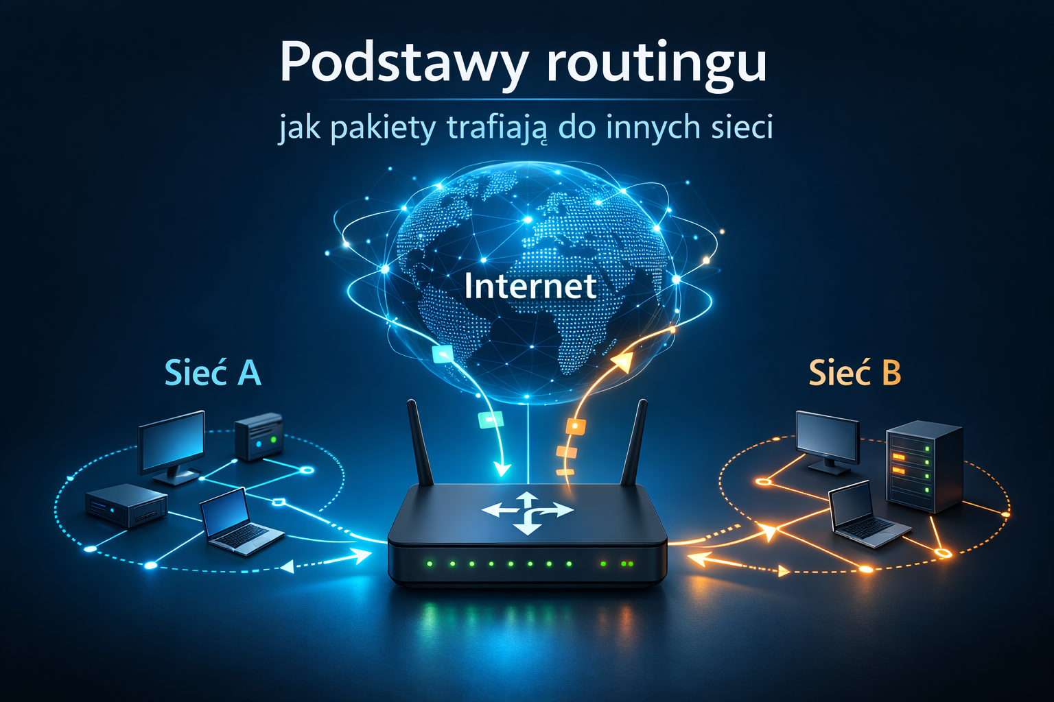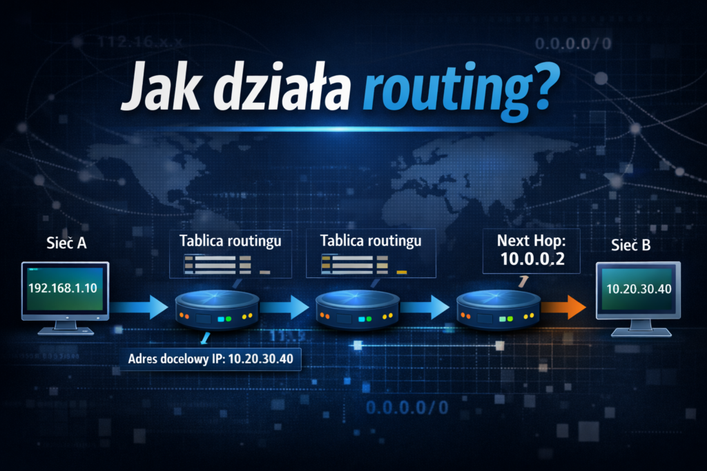 Gdy router otrzyma pakiet, analizuje jego docelowy adres IP. Następnie sprawdza w swojej tablicy routingu, którędy najlepiej wysłać go dalej. Jeśli zna dokładną trasę do tej sieci, kieruje pakiet do odpowiedniego kolejnego routera albo bezpośrednio do sieci docelowej. Jeśli nie ma bardziej szczegółowego wpisu, może użyć trasy domyślnej, czyli takiego “planu awaryjnego” dla ruchu do nieznanych sieci.