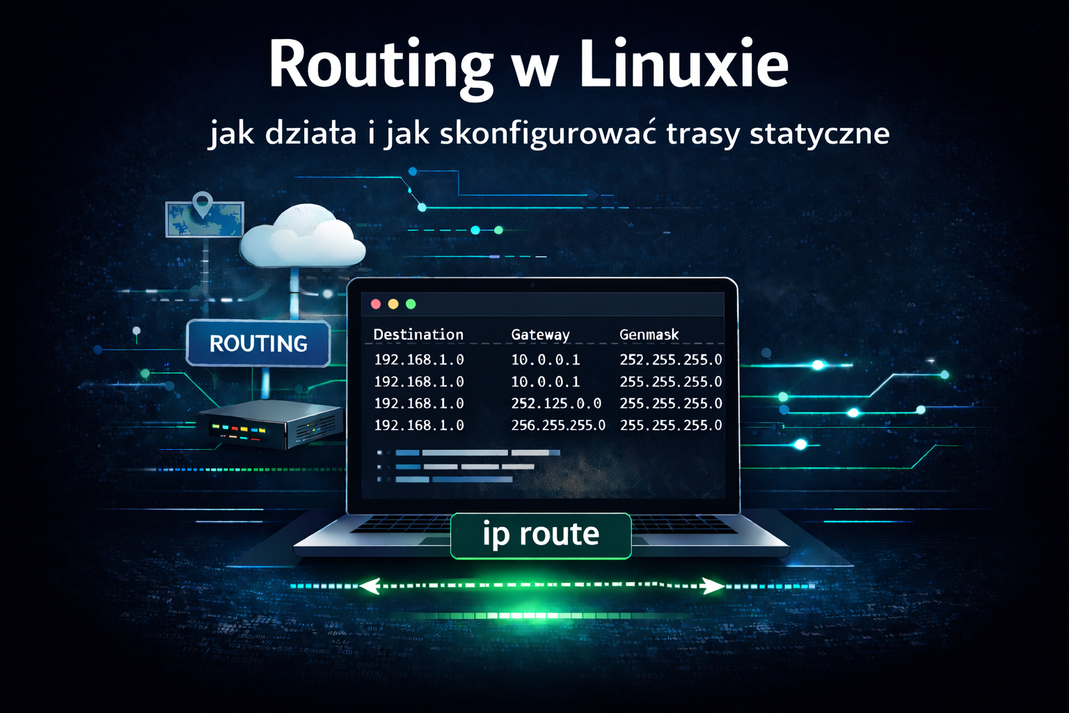 Trzecia część poradnika dotyczy routingu w systemach Linux. To temat, który na początku może wydawać się trochę abstrakcyjny, bo pojawiają się takie pojęcia jak tablica routingu, brama, interfejs sieciowy czy trasa statyczna. W praktyce jednak całość sprowadza się do bardzo prostego pytania: którędy system ma wysłać pakiet, aby dotarł on do właściwej sieci? Jeśli Linux zna drogę, komunikacja działa poprawnie. Jeśli nie zna, pakiet po prostu nie dotrze tam, gdzie powinien.