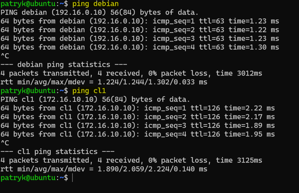 Przy testowaniu routingu bardzo łatwo skupić się tylko na routerach, a pominąć hosty końcowe. Tymczasem poprawna komunikacja w naszym laboratorium wymaga, żeby każda maszyna miała właściwą konfigurację dla swojej roli: Debian i CentOS muszą przekazywać pakiety i znać trasy do zdalnych sieci, a Ubuntu oraz hosty Windows muszą mieć poprawnie ustawione bramy domyślne. Jeśli dodatkowo testujesz po nazwach, to dochodzi jeszcze konfiguracja z poprzedniego artykułu, czyli hosts, DNS i hostname. Jeśli testy ping pomiędzy wszystkimi maszynami wychodzą pomyślnie, to znak, że cała seria została złożona w jedną działającą całość. U mnie komunikacja z Ubuntu do Debiana i Windowsa CL1 przebiega od tej pory pomyślnie.