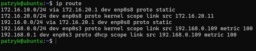 W tym przypadku uczymy system, że aby dostać się do sieci 172.16.10.0/24, trzeba wysłać ruch do bramy 192.16.0.10. Jest to adres routera, który zna dalszą drogę do tej sieci. Tak jak wcześniej, po aktywowaniu połączenia warto sprawdzić wynik poleceniem ip route.