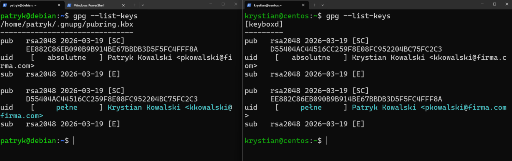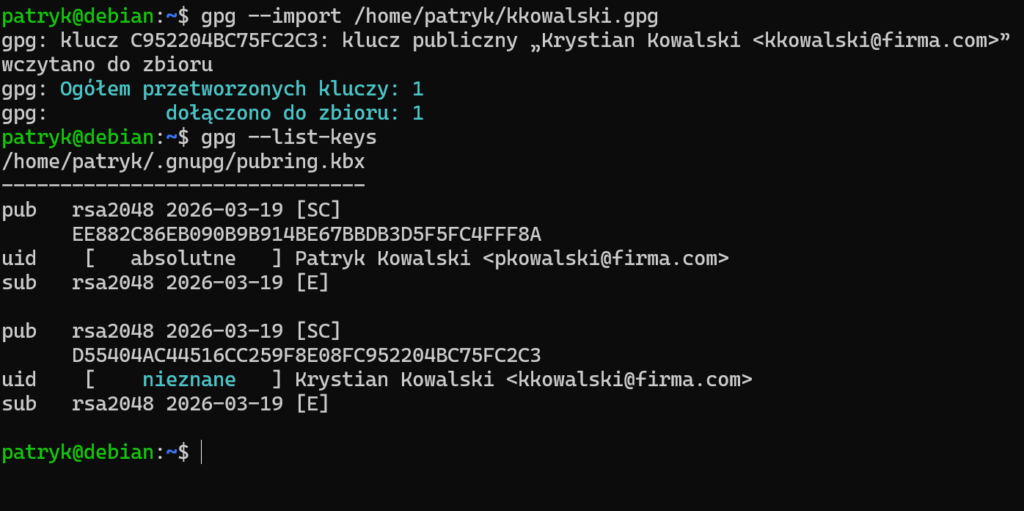 Po tej operacji klucz stanie się wiarygodny. Co można zweryfikować poleceniem gpg –list-keys. Na obu systemach klucze powinny być zaufane.