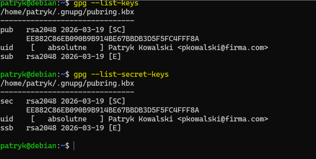 To polecenie pokazuje zarówno klucze publiczne, jak i prywatne dostępne w lokalnym keyringu. Dzięki temu od razu widzisz, czy GPG poprawnie utworzył komplet potrzebny do szyfrowania, odszyfrowywania i podpisywania danych.