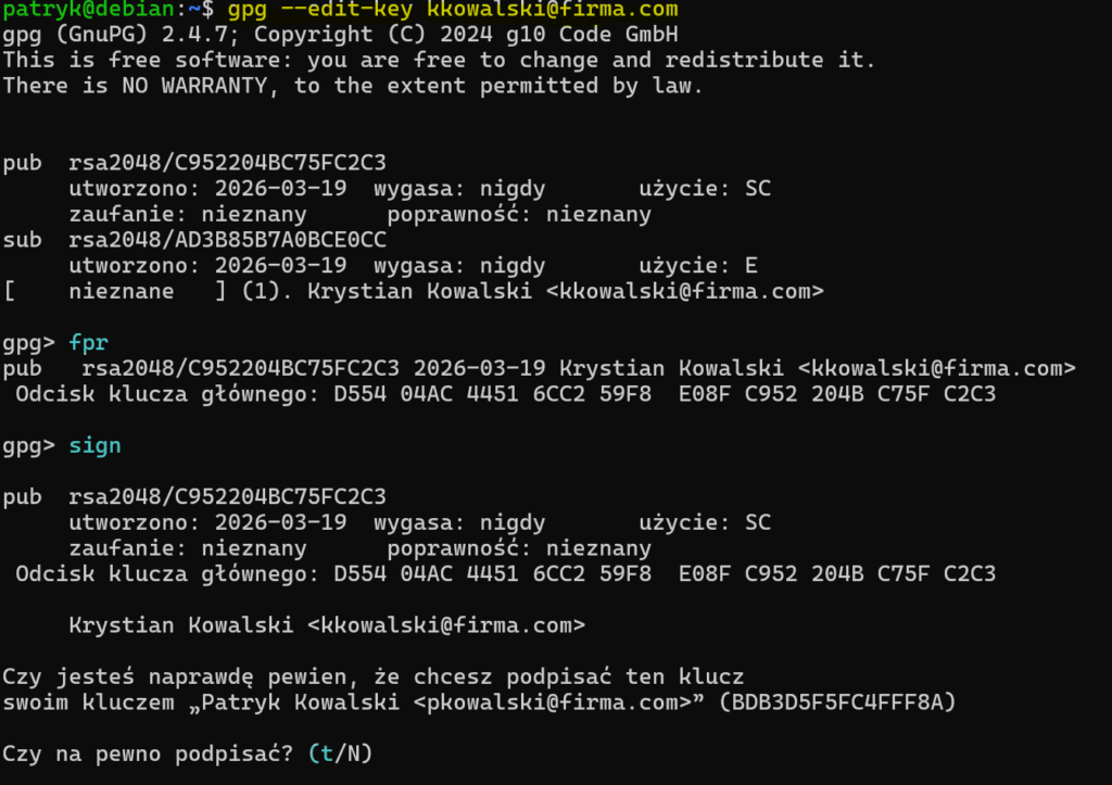 Przed podpisaniem klucza warto porównać fingerprint innym kanałem niż sam przesyłany plik, na przykład przez SSH, komunikator albo rozmowę. Jeśli odcisk się zgadza, podpisanie klucza oznacza, że od tego momentu lokalnie traktujesz go jako wiarygodny. Podpisanie musimy potwierdzić hasłem do swojego klucza prywatnego.