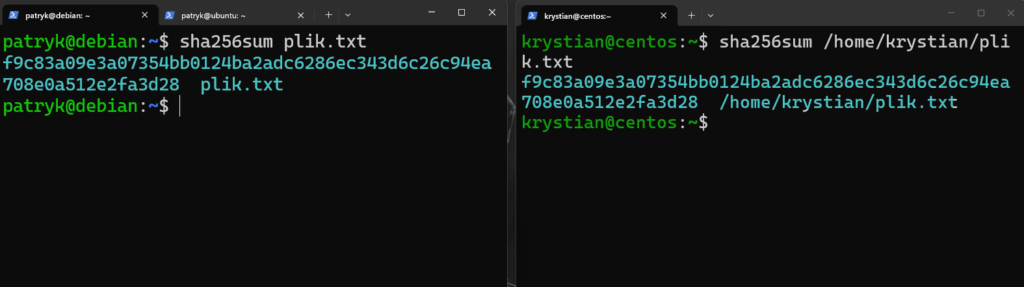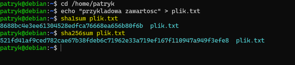 Polecenia sha256sum i sha512sum wyliczają skróty z rodziny SHA-2 o długości odpowiednio 256 i 512 bitów. Z kolei md5sum jest dziś raczej starszym, historycznym narzędziem niż najlepszym wyborem do nowych materiałów, więc w przykładach praktycznych lepiej eksponować SHA-256 lub SHA-512.