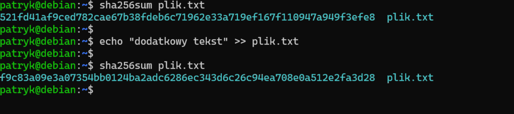 Jeśli zmienisz choćby jeden znak w pliku, jego hash będzie inny. To właśnie dlatego sumy kontrolne są tak wygodne przy pobieraniu obrazów ISO, kopii zapasowych albo plików przesyłanych pomiędzy serwerami – nie ukrywają treści, ale bardzo dobrze pokazują, czy dane pozostały identyczne.
