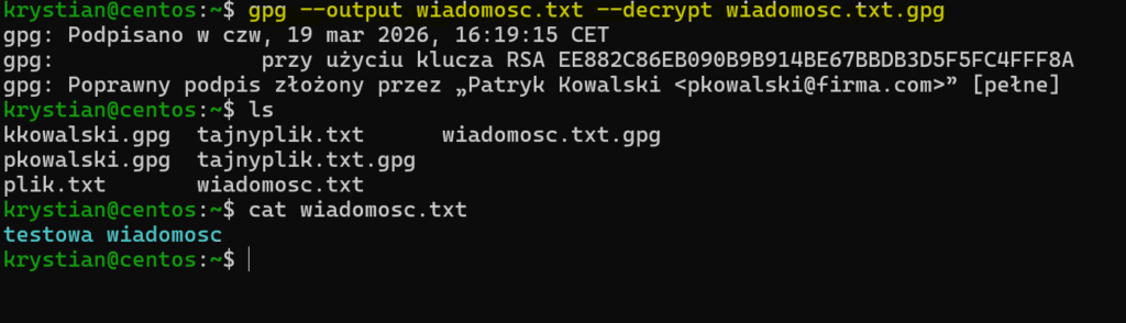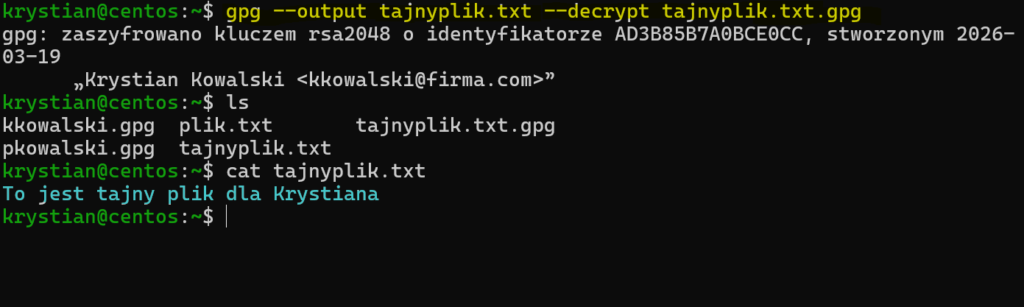 Po stronie CentOS-a Krystian odszyfrowuje plik poleceniem: