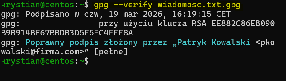 Jeśli podpis jest poprawny i klucz Patryka został wcześniej zaimportowany oraz oznaczony jako zaufany, GPG pokaże informację, że podpis został zweryfikowany.